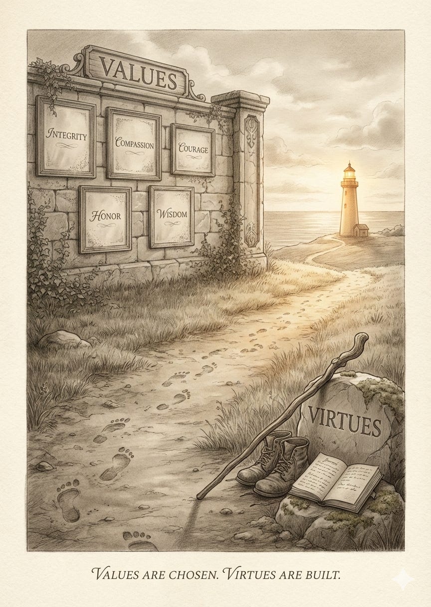 That’s the beautiful thing about virtues: they can be passed down. Values are personal — they live and die with you. But virtues, once built, become a gift you can leave behind. A shelter others can stand in. A light they can steer toward.